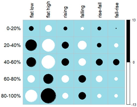 In order to conduct a chi-square test on FVR, its values were binned into five categories with a range of 20%, as shown in Table 8. This test revealed a significant effect for FVR (χ2(20) = 665.92, p < 0.0001). When PFFE made up 60% or less of the vowel, flat–low profiles made up the majority of tokens. It was still the most common profile type at 60–80% percent PFFE, but flat–high and falling were also frequent; at 80–100% PFFE, flat–high was the most common profile type. The results of the chi-square test are visualized in a correlation plot in Figure 7.