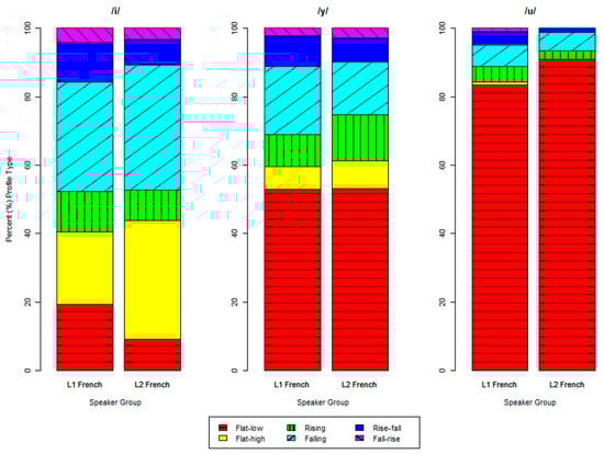 Results from a multinomial logistic regression, shown in Table 9, revealed significant interactions between all three variables. First, an interaction between vowel and speaker group was present, as shown in Figure 8, such that L1 and L2 speakers showed different distributions of profile type for /i/: L2 speakers showed lower rates of flat–low and higher rates of flat–high and falling, two profile types characterized by high initial energy, relative to L1 speakers. Additionally, L2 speakers utilized more rising tokens than L1 speakers for /y/, indicating that they started off at a low frequency but increased the intensity over the course of PFFE to approximate the high-energy fricative.