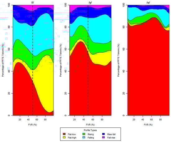 An interaction between vowel and FVR was also present, such that as FVR increased, the distribution of profile types changed for /i/ and /y/, as shown in the conditional density plot in Figure 9. Starting at approximately 50% FVR (indicated in the figure by a dotted line), flat–low tokens greatly decreased and flat–high tokens greatly increased for /i/, and the proportion of flat–high and falling tokens slightly increased for /y/.