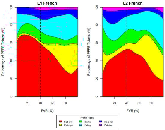 Finally, an interaction was present between speaker group and FVR, as shown in Figure 10. For FVRs ranging from approximately 40 to 100%, L1 and L2 speakers showed similar profile type distributions. From 0 to 40%, however, L1 speakers predominantly used a flat–low profile, while L2 speakers exhibited much greater variation.