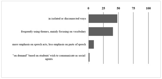 In considering their classroom delivery before their professional learning, the teachers were asked to report retrospectively on their frequency of use of various teaching practices, including a focus on language structures, the correction of student errors as they occurred, oral interaction and written activities related to everyday life, teaching and learning organized around real-life situations, encouraging students to identify competences that they need to carry out a task, and the use of a language portfolio to track students’ development. As Figure 2 shows, the teachers’ reported practices before their CEFR-related professional learning focused, above all, on teaching language structures and correcting student errors as they occurred. The teachers also reported paying less attention to oral interaction and written activities related to everyday life and to teaching and learning organized around real-life situations. This strong focus on grammatical accuracy with less attention to real-life uses of language were in line with the FSL guidelines in place at that time which emphasized the mastery of grade-specific grammatical structures through the completion of learning activities targeting oral and written literacy. Encouraging students to identify competences that they needed to carry out a task and the use of a language portfolio to track students’ development were the least-frequently-reported strategies. When reflecting on their classroom delivery related to the development of the receptive skills of listening and reading and the productive skills of speaking and writing (see Figure 3), the teachers reported placing the greatest emphasis on linguistic competence and less emphasis on pragmatic competence and sociolinguistic competence (e.g., level of formality, politeness conventions). The teachers were also asked to reflect on how they presented language in the classroom prior to their CEFR-related professional learning. Forty-eight percent of the teachers reported presenting language in “isolated or disconnected ways,” and 41% reported “using themes, mainly focusing on vocabulary” (see Figure 4). Again, this focus on forms in isolation and the use of themes to direct vocabulary teaching were consistent with the FSL curriculum guidelines in place at that time.