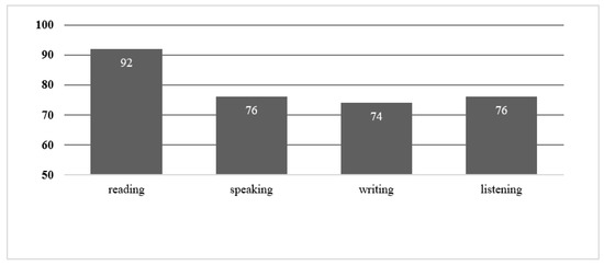 Looking level by level, while reading remained the area of greatest strength regardless of the DELF level the students challenged, the overall scores mask interesting differences. Starting with the results for the A2 exam (see Figure 7), the mean scores were 22.95/25 (92%) for reading, followed by 18.89/25 (76%) for listening, 18.88/25 (76%) for speaking, and 18.54/25 (74%) for writing. The score for reading was statistically significantly higher than for the remaining skills (p < 0.005 for listening, p < 0.005 for speaking, and p < 0.005 for writing), with no significant differences among the other skills. For those students who challenged level B1 (see Figure 8), the mean scores were 19.46/25 (78%) for reading, 17.78/25 (71%) for writing, 17.66/25 (71%) for speaking, and 16.90/25 (68%) for listening. The score for reading was statistically significantly higher than for the remaining skills (p < 0.005 for listening, p < 0.005 for speaking, and p < 0.005 for writing), while the score for listening was significantly lower than the other three skills (p < 0.005 for reading, p = 0.035 for writing, and p = 0.019 for writing). The scores for writing and speaking were not significantly different from each other (p = 0.697). Finally, for those students who challenged level B2 (see Figure 9), the highest mean scores were 15.96/25 (64%) for speaking and 15.92/25 (64%) for reading, while the students scored 15.25/25 (61%) for listening and 14.63/25 (59%) for writing. The score for writing was significantly lower than the score for the top two skills (p = 0.003 reading, p = 0.001 speaking), but not significantly lower than the score listening (p = 0.141).