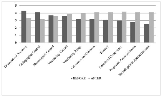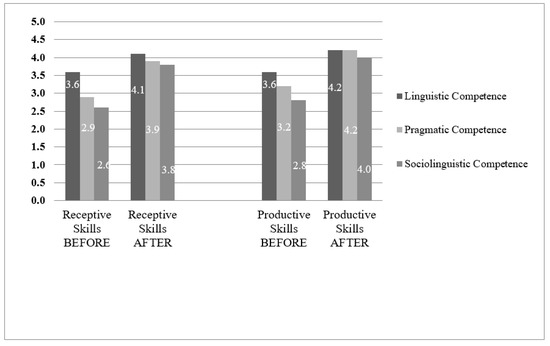 Emphasis (0–5) on Competences in Receptive and Productive Skills before vs. after Professional Learning.