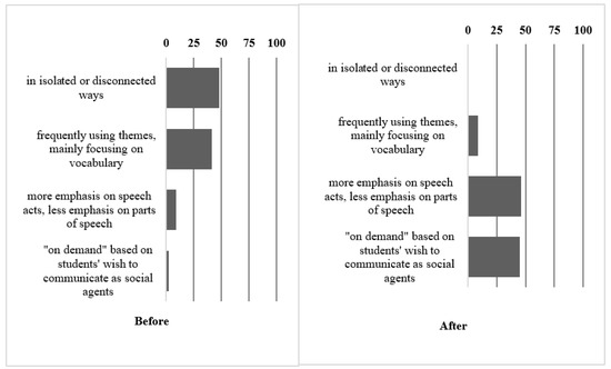 When identifying their priorities for classroom delivery after their CEFR-related professional learning (see Figure 11), the teachers reported shifting their focus away from their previous attention to language structures and error correction above all and towards the importance of situating such a focus within teaching that now emphasizes everyday real-life situations, whether that be in relation to their organizing principles, oral interaction activities, or written activities. They also reported now focusing more on encouraging students to identify the competences that they need to carry out particular tasks. These changes are very much in line with a CEFR-informed, action-oriented approach to task-based language teaching which, as Piccardo (2014) explained, involves supporting students as they make judgements about what linguistic and non-linguistic tools they need to accomplish the communicative activities that real-world interactive tasks require. This change in focus to more contextualized language use after their professional learning was also evident in the teachers’ responses to questions about their focus when addressing the development of receptive and productive skills (see Figure 12). While linguistic, pragmatic, and sociolinguistic competences all saw an increase, the most notable changes, in keeping with their reported planning practices, were in the teachers’ reported increase in focus on sociolinguistic and pragmatic competences. Although linguistic competence still maintained the highest teacher priority, these reported changes resulted in a more-balanced emphasis across all three competences. An even more dramatic shift was revealed when the teachers were asked to reflect on how they now presented language in the classroom after their CEFR-informed professional learning (see Figure 13). Recall that, prior to their professional learning, an overwhelming number of teachers (89%) reported presenting language either in “isolated or disconnected ways” or “using themes, mainly focusing on vocabulary.” Strikingly, after their professional learning, 46% of the teachers reported “more emphasis on speech acts” and 45% reported presenting language “on demand, based on what students wished to communicate as social agents.” No teacher reported continuing the practice of presenting language in “isolated or disconnected ways.” This reported emphasis on presenting language within the context of speech acts and students’ communicative needs resulting from their actions as social agents is very much in keeping with the emphasis in the current FSL guidelines on authentic and meaningful interaction that shifts teaching away from the presentation of language “as a system of disconnected and isolated components” (Ontario Ministry of Education 2014, p. 9) and that aims, instead, to focus FSL learners “on what it is they are trying to communicate; what they need others to understand, and why” (Ontario Ministry of Education 2014, p. 7). It is also very much in line with the goal of task-based language teaching within an action-oriented approach, which seeks to embed a focus on form within real-world communication that is needed for the type of interaction which takes place within carefully designed pedagogical tasks (Long 2014). Recall that the work by Faez and her colleagues (Faez et al. 2011a; Faez et al. 2011b) also showed that the more practice FSL teachers had with the type of task-based approach at the heart of the CEFR, the more comfortable they were incorporating a focus on form within their communicatively-oriented teaching. However, again, how teachers in other contexts or with less-positive orientations to the CEFR might react is not known.