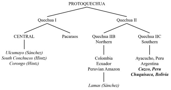 - Kalt, Susan E. 2009b. The speech of children from Cusco and Chuquisaca. The Archive of the Indigenous Languages of Latin America. Access Is Currently Restricted Due to Age of interviewees. Available online: https://www.ailla.utexas.org/islandora/object/ailla%3A124493 (accessed on 1 February 2019).
