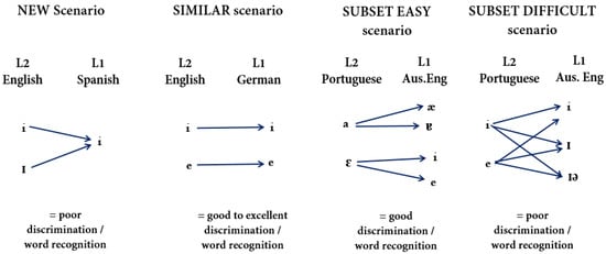 In contrast, German learners, who have a /i/–/ɪ/ contrast in their L1 vowel inventory, have fewer difficulties when perceiving the contrast in English than Spanish learners (Bohn and Flege 1990; Flege et al. 1997; Iverson and Evans 2007). It is likely that this is an example of the SIMILAR learning scenario in L2LP1, and PAM’s two-category assimilation, whereby the two non-native sounds in the contrast are mapped onto two separate native vowel categories. Both PAM and L2LP would predict that a scenario (or assimilation pattern) of this type would be less problematic for listeners to discriminate than a NEW scenario (or Single Category assimilation) as they can rely on their existing L1 categories to perceive the difference between the L2 phones. In the L2LP framework, the learning task is considered to be easier because learners simply need to replicate and adjust their L1 categories so that their boundaries match those of the L2 contrast (van Leussen and Escudero 2015; Elvin and Escudero 2019; Yazawa et al. 2020). A third scenario, known as the SUBSET scenario (i.e., multiple category assimilation) in L2LP, occurs when one or both sounds in the L2 contrast are perceived as two or more native L1 categories. This scenario may be comparable to focalised, clustered or dispersed uncategorised assimilation in PAM (Faris et al. 2016). While some studies suggest that this learning scenario is not problematic for L2 learners (e.g., Gordon 2008; Morrison 2009, 2003), other studies have shown the SUBSET scenario (or PAM’s uncategorised assimilation) to lead to difficulties in discrimination (Escudero and Boersma 2002), particularly when a perceptual or acoustic overlap between the two non-native sounds in the contrast and the perceived native categories occurs (Bohn et al. 2011; Elvin et al. 2014; Tyler et al. 2014; Vasiliev 2013). That is, the two vowels in the contrast are perceived as (or are acoustically similar to) the same multiple categories. For example, Elvin (2016) found that the Brazilian Portuguese vowels /i/ and /e/ were both acoustically similar to and perceived as the same multiple categories in Australian English, namely /iː/, /ɪ/, and /ɪə/. In the L2LP framework, this poses a difficult challenge for learners as they must first realise that certain features or sounds in the target language do not exist, that they cannot process them in the same manner as their L1, and must therefore proceed in a similar manner as with the learning task for the NEW scenario (Elvin and Escudero 2019). The SUBSET scenario can therefore be divided into two categories: SUBSET EASY (or uncategorised non-overlapping in PAM), when the two vowels in the L2 contrast are acoustically similar to and perceived as multiple L1 categories without any overlap, and SUBSET DIFFICULT (or uncategorised overlapping), where the two vowels in the L2 contrast are acoustically similar to and perceives as multiple categories with overlap. A diagram that shows examples of the L2LP scenarios can be seen in Figure 1.