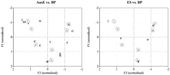 The left panel shows the averaged normalised F1 and F2 values (Hz) for the thirteen AusE5 (black), and seven BP (gray, circled) vowels. The right panel shows the averaged normalised F1 and F2 values (Hz) for the five ES (black) and seven BP (gray, circled) vowels.