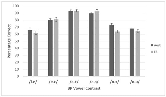 Based on the acoustic overlap scores in Table 3, we would predict that the BP contrasts with little to no acoustic overlap would be perceptually easier to discriminate than those with higher overlap scores. In particular, both groups should find BP /o/–/u/ difficult to discriminate and BP /a/–/ɛ/ easy to discriminate. However, these acoustic comparisons do predict group differences: ES listeners should find BP /a/–/ɔ/ and /i/–/e/ easier to discriminate than AusE listeners, whereas BP /e/–/ɛ/ should be easier for AusE than ES listeners to discriminate.