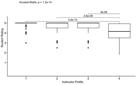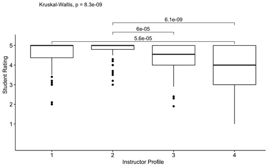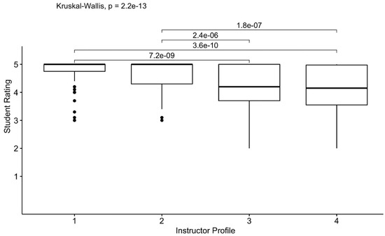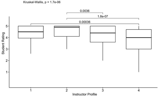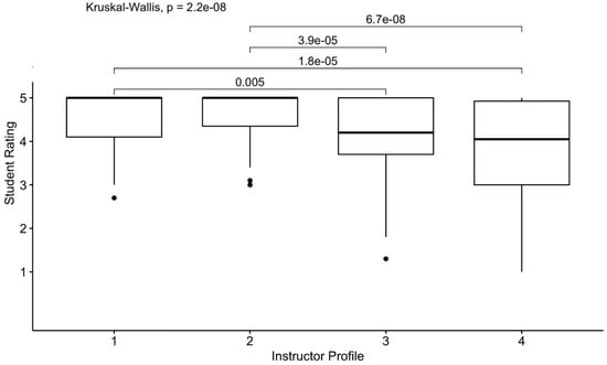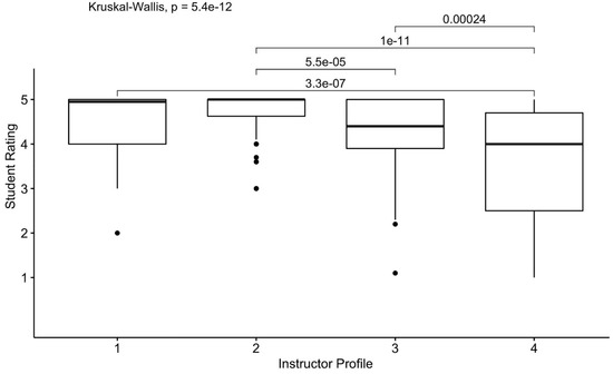A Kruskal–Wallis test showed that instructor type significantly affected student ratings on content knowledge, H(3) = 62.02, p < 0.001; η2 = 0.16. The median and interquartile (IQR) of ratings for Profiles 1, 2, 3, and 4 were 5.0 (IQR = 0.25), 5.0 (IQR = 0.7), 4.2 (IQR = 1.3), and 4.15 (IQR = 1.43), respectively. A post hoc analysis using paired samples Wilcoxon test was conducted with a Bonferroni correction, resulting in a significance level set at 0.0125 (0.05/4). There were significant differences between the ratings assigned to Profiles 1 and 3 regarding content knowledge (z = −5.79, p < 0.001), as well as between Profiles 1 and 4 (z = −6.27, p < 0.001), Profiles 2 and 3 (z = −4.71, p < 0.001), and Profiles 2 and 4 (z = −5.22, p < 0.001). However, there were no significant differences between Profiles 1 and 2 (z = −1.39, p = 0.952) and 3 and 4 (z = −0.56, p = 0.952). See Figure 1 below.