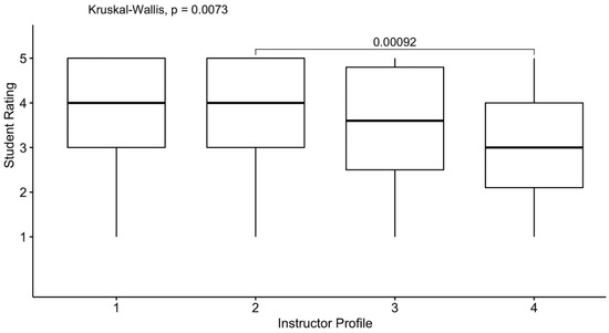 A Kruskal–Wallis test showed that instructor type significantly affected student ratings regarding perceived ability to provide culturally sensitive feedback, H(3) = 29.60, p < 0.001; η2 = 0.07. The median and IQR of ratings for Profiles 1, 2, 3, and 4 were 4.5 (IQR = 1.05), 4.9 (IQR = 0.98), 4.4 (IQR = 1.4), and 4 (IQR = 1.7), respectively. A post hoc analysis using a paired samples Wilcoxon test was conducted with a Bonferroni correction, resulting in a significance level set at 0.0125 (0.05/4). There were significant differences between the ratings assigned to Profiles 1 and 4 (z = −3.57, p < 0.001), Profiles 2 and 4 (z = −5.22, p < 0.001), and Profiles 2 and 3 (z = −2.88, p = 0.004). However, there were no significant differences between Profiles 1 and 2 (z = −1.85, p = 0.39), Profiles 1 and 3 (z = −1.21, p = 1.0), and Profiles 3 and 4 (z = −2.35, p = 0.12). See Figure 5 below.
