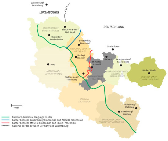 - Beyer, Rahel, and Fernand Fehlen. 2019. Der germanophone Teil Lothringens. In Handbuch des Deutschen in West-und Mitteleuropa. Sprachminderheiten und Mehrsprachigkeitskonstellationen. Edited by Rahel Beyer and Albrecht Plewnia. Tübingen: Narr, pp. 106–54. [Google Scholar]