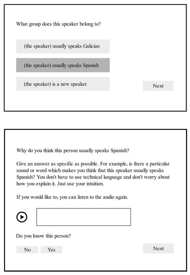 These definitions were provided in case listeners were unfamiliar with the neofalantes label; although the label is widely used, listeners were recruited to be from a diverse set of backgrounds and not all may have been familiar with it. The trial procedure is illustrated in Figure 1 (for the Galician version, see Figure A1). Participants were instructed to listen to each sentence over headphones and indicate to which group the speaker belonged. The sentence was played only once. Participants were subsequently asked to comment on whether particular factors had influenced their decision (see Section 5. Discussion). In this case, they were allowed to listen to the audio again with no limit on the number of times. Although the experiment was distributed online, it was only advertised through friends and acquaintances of the first author to give some control over who participated and seek to guarantee that participants listened to the stimuli over headphones in a quiet environment. In fact, participants overall spent a considerable amount of time completing the task (mean experiment duration = 65.22 min), which indicates that they took the time to provide detailed comments. Given that the recruitment method was through friends of friends, and that this was also the case for recruiting the speakers who produced the recordings, participants were asked whether they knew the speaker. Participants indicated that they knew the talker in 114 trials (1.56% of the total number of trials); these trials were excluded from further analysis. Finally, participants completed a language background questionnaire which elicited demographic data and information about their residential history and language background, including how they acquired and use their languages.