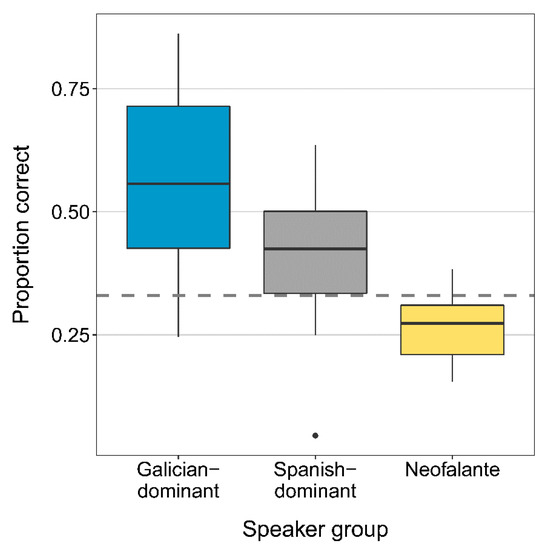 Boxplot showing accent identification scores (proportion correct) for all listeners. The three boxplots represent speaker group: Galician-dominant on the left, Spanish-dominant in the centre and Neofalantes on the right. The dashed line represents chance level performance.