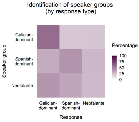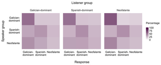 Confusion matrix showing the identification of speaker groups by response type. The y-axis represents the speaker group (Galician-dominant, Spanish-dominant, and Neofalantes and the x-axis represents the response all listeners gave per speaker group. The darker the colour the higher the percentage of responses in that category.