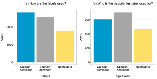Barplots showing (a) counts for each of the three speaker labels and (b) counts for the Neofalantes label. The plot on the left shows how often each of the three speaker groups labels was selected, with the speaker group labels on the x-axis (Galician-dominant, Spanish-dominant and Neofalantes and frequency counts on the y-axis. The plot on the right shows how often each speaker group (Galician-dominant, Spanish-dominant and Neofalantes) was identified as Neofalantes.