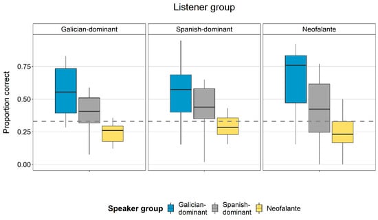 Boxplot showing accent identification scores (proportion correct) by the three listener groups: Galician-dominant (left rectangle), Spanish-dominant (middle rectangle) and neofalantes (right rectangle). Boxplots represent speaker group: Galician-dominant on the left, Spanish-dominant in the centre and Neofalantes on the right. The dashed line represents chance level performance. The accent identification pattern was very similar for all three listener groups.