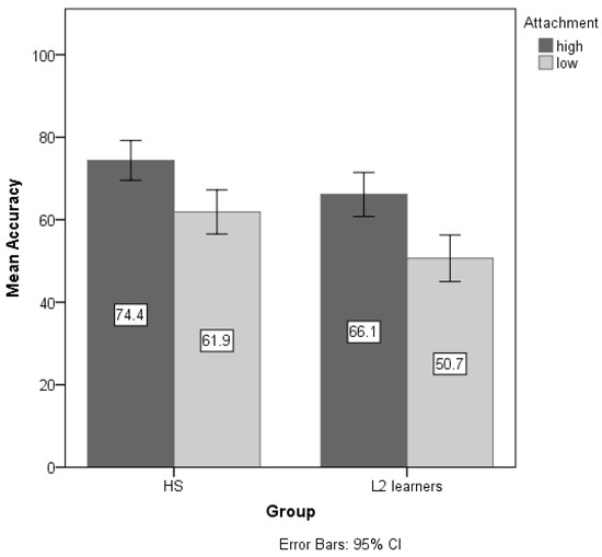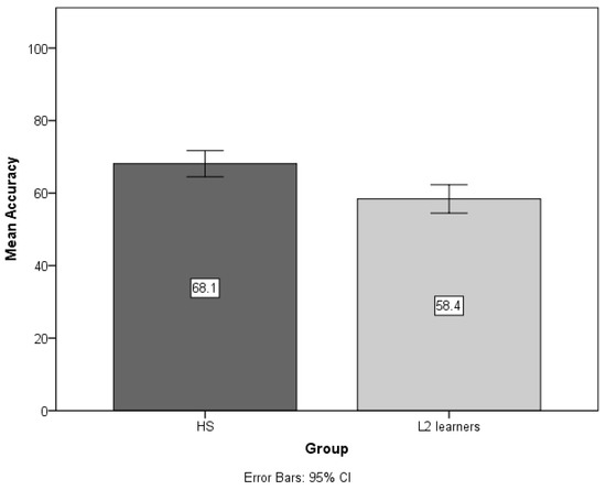 A one-way ANOVA compared L2 learners and HS according to their DELE scores and revealed a significant effect for Group (F(1,38) = 4.954, p = 0.032). In other words, HS’ average DELE scores were significantly higher than those of L2 learners.