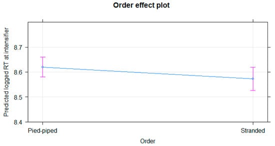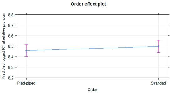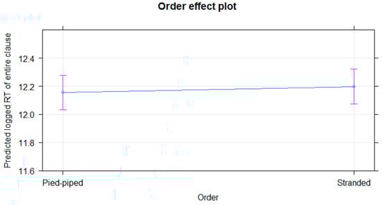 Order. Please note that the plot shows the binary log of the dependent variable. A back-transformation of the predicted values (pied-piping: 8.619808, stranding: 8.581056) reveals a difference of around 10.5 ms.