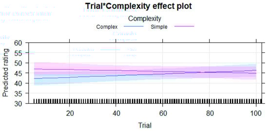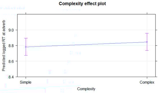p = 0.002): The model predicts an advantage for the simple conditions. The difference of the back-transformed predicted values (complex: 8.845969, simple: 8.783326) is about 20.5 milliseconds.