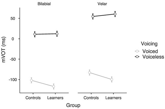 The Portuguese productions of both groups of native speakers, the controls and the EFL learners, were compared against each other. The dependent variable was mVOT (ms), and the factors were place (bilabial, velar), voicing (voiced, voiceless), and group (controls, EFL learners). The descriptive statistics (mean and standard deviation, M (SD)) were as follows. For /b/, mVOT values for the controls were −112 (22) ms, and learners’ values were −117 (25) ms. For /ɡ/, the mean for the controls was −83 (22), and the learners’ mean was −100 (18). For /p/, the controls’ mean was 11 (6) and learners’ mean was 12 (6). For /k/, the mean for the controls was 55 (11), and learners’ mean was 61 (10).