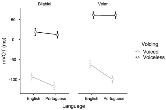 Inferential statistics were conducted on by-speaker averages. We calculated the average VOT per speaker per condition. We call this metric mVOT for mean VOT. This resulted in three data sets, which were then combined into larger data sets to conduct a variety of statistical comparisons across speaker groups and conditions. The first data set comprised the Portuguese control data: It included four average values per participant, one per plosive /p b k ɡ/: 28 (speakers) × 4 (phonemes) = 112 observations. The second data set comprised the Portuguese (L1) productions of the EFL learners: It included four average values per participant, 28 (speakers) × 4 (phonemes) = 112 observations. The third data set comprised the English (L2) productions of the EFL learners, 28 (speakers) × 4 (phonemes) = 112 observations. Each of these values is an average over 20 observations. In sum, the data set comprising 6714 raw VOT measurements was reduced, by means of by-speaker and by-condition averaging, to 336 observations. Data reduction and wrangling were done with an R script (R Core Team 2018), with the functions provided by the package tidyverse (Wickham et al. 2019). Data analyses were conducted in Jamovi (The Jamovi Project 2020), a free open-source GUI for R. The R packages used in Jamovi were afex (Singman et al. 2020), emmeans (Lenth 2018), and esci (version 0.9.1 for Jamovi, written by Robert J. Calin-Jageman). See jamovi.org/library (accessed on 22 June 2021) for a list of available modules. Synthetic data and code, including the Jamovi files, may be made available to readers interested in reproducing our analyses. Readers may contact the corresponding author.