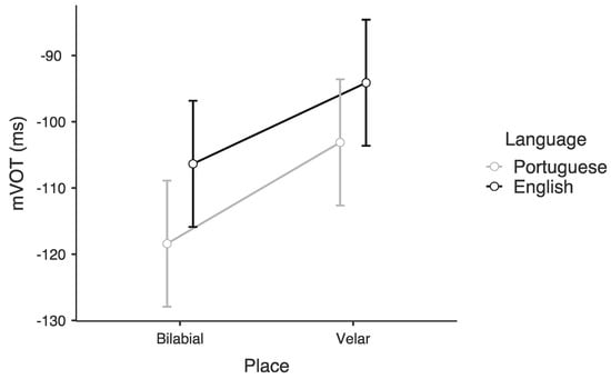 Mean (and 95% CI) mVOT values plotted as a function of place (bilabial, velar) and language (L2 English, L1 Portuguese). Data come from 28 native speakers of Portuguese learning English as a foreign language in Brazil. The sample includes only voiced plosives with prevoicing.