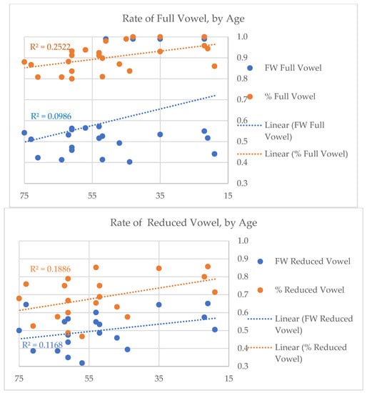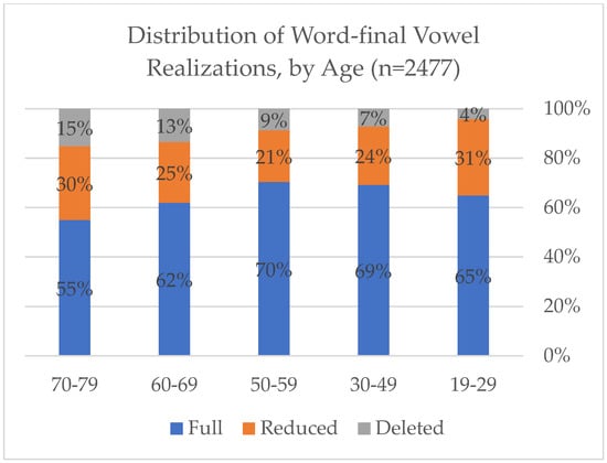 - We hypothesize that there are differences between older and younger speakers in both the rate and the factors which condition selection between full, reduced and deleted word-final vowels. This is motivated by sociolinguistic expectations that younger speakers exhibit more use of innovative variants than older speakers, allowing us to understand linguistic change through an apparent time lens.