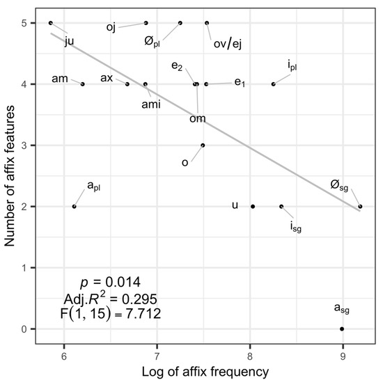 With comparable feature-based and frequency-based accounts of Russian nouns, I now consider the relationship between the two. As can be seen in Figure 1, the number of features of a given affix is inversely correlated with the log of the affix’s token frequency (F (1,15) = 7.712, Adj. R2 = 0.295, p = 0.014). In other words, more frequent affixes have fewer features in this analysis of Russian nouns. This corresponds with the expected effects in processing for both; frequent affixes and affixes with fewer features are expected to be processed faster. The correlation between features and frequency is interesting, particularly given that a possible connection may arise between features and frequency based on the frequency distribution of paradigm cells, differentiation, and analogical change. The larger set of Russian affixes provides some evidence that a correlation is not an accident, something that was not as clear in the limited set of German adjective affixes in Clahsen et al. (2001b). Furthermore, the correlation is significant but is only moderate (Adj. R2 = 0.295). The moderate relationship between the two corresponds with the notion that the connection between the two is not direct; instead, it is mediated by processes of change, allowing other factors to influence the relationship between them to some extent. This gives rise to a connection between the two that is significant but not immune to some variability.8 Within the context of arguments for the importance of features in processing, the correlation between the two suggests that the validity of one factor may depend on whether the other is considered for the same data. The relationship between affix features and affix frequency suggests that they are, at least in part, tapping into the same underlying attributes of inflectional structure. The extent to which each factor is predictive in processing is an empirical one; however, only when comparing the two can it be clear to what extent they are accounting for the same effects in processing and which, if either, factor is a better predictor overall.
