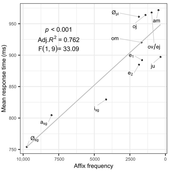 Effect of features on mean response time by affix.