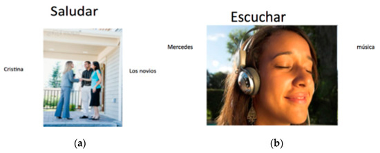 Figure 1. Sample of items used in the oral elicitation task: (a) shows the picture used for the verb saludar ‘to greet’; (b) shows the picture used for the verb escuchar ‘to listen’.