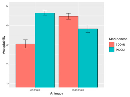 Participants were expected to show some preference for DOM extension to inanimate objects in the AJT (Bautista Maldonado and Montrul 2019). Therefore, participants were expected to judge sentences with DOM-marked inanimate objects as more acceptable than sentences that omitted DOM with animate objects.