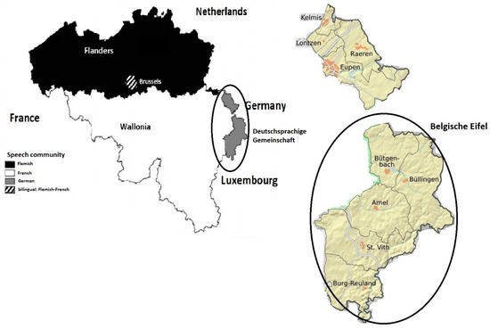The Belgische Eifel constitutes five districts of the Deutschsprachige Gemeinschaft, namely, Amel, Büllingen, Burg-Reuland, Bütgenbach and St. Vith, and is a predominantly rural area with its 631 km2 and a population of 30,219. Dialectological studies report that the majority of Moselle Franconian vernaculars in this area are closely related to the Moselle Franconian spoken in the Éislek region of Luxembourg (Bruch 1953; Mattheier and Wiesinger 1994; Wiesinger 1982a, 1982b).
