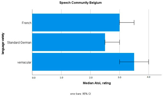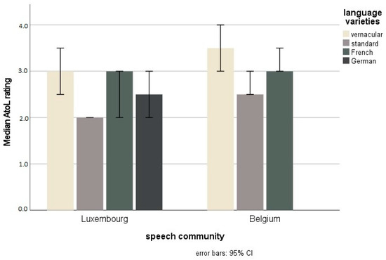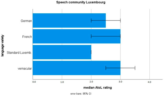 The differences between the AtoL ratings of French vs. all other language varieties did not prove to be significant, i.e., French vs. vernacular (z = −1.46, p = 0.145), French vs. German (z = −0.20, p = 0.884) and French vs. Standard Luxembourgish (z = −2.40, p = 0.016, non-significant with Bonferroni correction, significance level raised to α = 0.008). Figure 3 summarizes the results for Luxembourg.