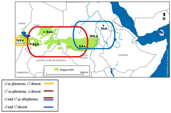 According to Owens (1993b, p. 165) the occurrence of a uvular implosive ʛ in the Chari-Baguirmi region provides strong evidence for a Fulani substratal input in WSA, as Fulani (Niger-Congo) is among the few languages in the area with implosive ʛ. In fact, if we look at the geographic distribution of ʛ across the Baggara Belt (cf. Figure 4), it is plausible that ʛ represents an innovation emerging in Chad from a former voiced velar plosive q, which is still attested at the fringes of the Baggara dialect continuum (i.e., Nigeria in the west, Kordofan in the east). Furthermore, it is also true that ʛ is rarer than ɗ in the local languages spoken across the Baggara Belt. Despite this, there is no particular reason to postulate a Fulani substrate in Baggara Arabic, as the uvular implosive ʛ is also found in Afro-Asiatic (e.g., the Chadic languages Tera and Bole) and Nilo-Saharan (e.g., Central Sudanic-Sara-Bongo) languages spoken in the wider Lake Chad region (Maddieson 2013). In view of the above, ʛ can be better analyzed as a phonological innovation that emerged in Chad due to areal diffusion and whose geographical dispersion across the Baggara Belt is affected by both the persistence of conservative phonological features (i.e., q in NA and KA) and by the influence of ESA varieties (i.e., ġ in WA).