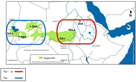 - Čížková, Martina, Pavel Munclinger, Mame Yoro Diallo, Iva Kulichová, Mohammed G. Mokhtar, Alioune Dème, Luísa Pereira, and Viktor Černý. 2017. Genetic Structure of the Western and Eastern African Sahel/Savannah Belt and the Role of Nomadic Pastoralists as Inferred from the Variation of D-loop mtDNA sequences. Human Biology 89: 281–302. [Google Scholar] [CrossRef]
