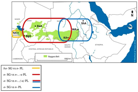 A preliminary version of this paper was presented at the 47th North Atlantic Conference on Afroasiatic Linguistics, INALCO, Paris, 24–25 June 2019. The paper is organized as follows. In Section 2, we offer a sociohistorical and linguistic introduction to the Baggara Belt. Section 3 briefly presents the data and the sources used for our comparative analysis. In Section 4, we explore the diatopic variation affecting a number of phonological, morphosyntactic, and lexical features in Baggara Arabic, while trying to reconstruct both internally and externally motivated diachronic changes. Section 5 finally attempts at reconstructing the dialect history of the Baggara Belt and provides some new hints on the internal classification of West Sudanic Arabic.