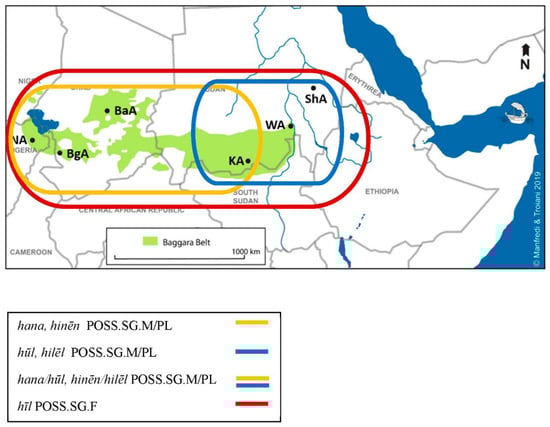 As we can see, western Baggara dialects (i.e., NA and BgA) are bound by the forms hana POSS.SG.M and hine(n) POSS.PL, as opposed to hūl POSS.SG.M and hilēl POSS.PL in WA. Conversely, the form hil/hīl POSS.SG.F is attested all across the Baggara Belt, whereas the singular feminine form hint is limited to NA and KA. In this overall situation, KA clearly falls into a buffer zone in which western and eastern lexical forms are still in competition (Manfredi 2012). On the one hand, han(a)/hint(a)/hinēn forms originate in Upper Egypt (between Gina and Luxor, Owens 1993b, p. 111) and they represent a WSA feature within Sudanic Arabic as they are also attested in the sedentary dialects of Chad. On the other hand, hūl/hīl/hilēl possessive particles are common to ESA dialects spoken by groups that penetrated Sudan directly from the Arabian Peninsula (i.e., ShA, Reichmuth 1983, pp. 111–12) and they are not attested in the urban dialects of eastern Sudan. The complex geographical distribution of hān(a)/hint(a)/hinēn and hūl/hīl/hilēl across the Baggara Belt (cf. Figure 7) seems to indicate a longstanding coexistence of these possessive forms and may corroborate the idea that speakers of ESA dialects have also been historically involved in the Baggarization process (cf. 2, 5).