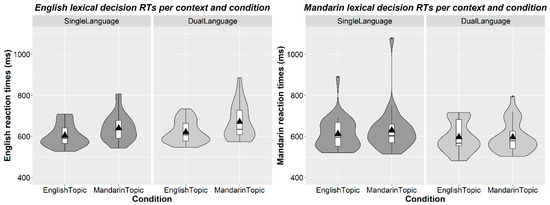 Violin plots showing the distribution of the lexical decision RTs for English (left) and Mandarin (right). Within each language plot, the single-language context is presented on the left and the dual-language context on the right. Within each context, English/L2 topic RTs are presented on the left and Mandarin/L1 topic RTs on the right. The outline of the violin plot shows the density of data points for the different RTs, with the boxplot showing the interquartile range. The thin horizontal line shows the median and the black triangle the mean.