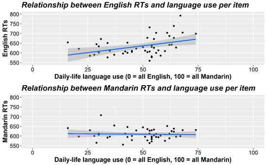 Scatter plots showing the correlation between daily-life language use and lexical decision RTs in English (top) and Mandarin (bottom). Each dot represents an individual item. Daily-life language use scores are averaged across participants for each item, with lower scores representing more English use and higher scores representing more Mandarin use in daily life.