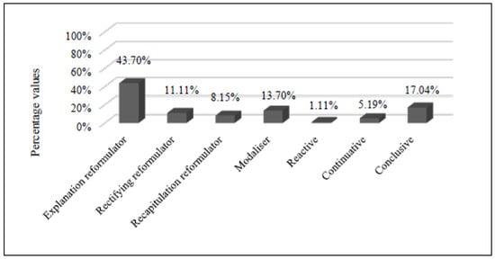 - Polanco, Fernando. 2016. Marcadores del discurso y contextos funcionales: La reformulación como construcción discursiva. Onomázein 34: 14–35. [Google Scholar] [CrossRef]