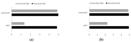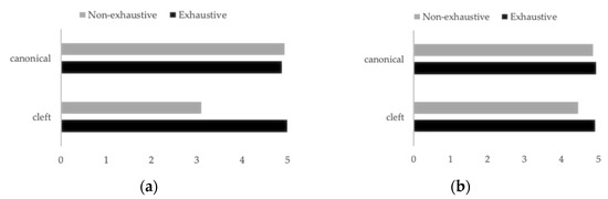 Ratings for clefted and canonical questions per answer type; (a) French natives ; (b) L2 learners.