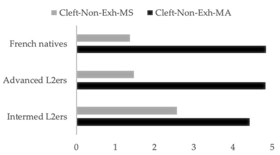Canonical questions are rated as completely natural in both contexts, averaging around 4.87 and 4.83 for natives, and 4.97 and 4.96 for learners in the “one” context (where one individual is mentioned as an answer) versus the empty set answer, respectively. On the other hand, both groups evince a degradation for clefts (1.64 for the native speakers, 2.02 for the learners) when answered by a negative answer such as “personne”, in line with predictions from the prior literature. Both groups also display the same trend in rating clefted questions as more felicitous in contexts where the answer mentions an individual, at 4.88 for native speakers and 4.64 for L2 learners. Overall, the learners’ patterns suggest that they are not judging test items randomly and that they have understood that clefted questions are associated with an existential presupposition in addition to the basic syntax of these questions.