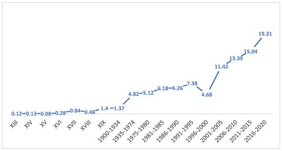 Even if tokens of parar de + inf date back to the Middle Ages, they are quite infrequent in the corpora before the twentieth century. As can be seen in Figure 1, the use of this verbal periphrasis peaked in the twenty-first century: only in the first two decades of this century did its normalised frequency of use exceed 10 occurrences per million words. The rise is especially notorious between 2016 and 2020, when parar de + inf reaches 19.31 occurrences per million words (for a more detailed explanation of the change over time of parar de + inf, cf. ).