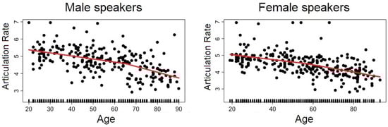 Overall, and as expected, considering the large number of factors known to affect speech, chronological age alone contributed only moderately to explain the variance of each speech descriptor. Most of the R2 reported in Table 3 are lower than 0.10. Nonetheless, for both female and male speakers, a fairly large amount of variation was accounted for by age alone for the descriptors associated with rate (28 and 30% for articulation rate, 19 and 16% for speech rate, 15 and 19% for AMR, respectively). Noteworthy, among the voice descriptors, variance of the SdF0 descriptor for both sexes (13% and 14%) and variance of the CPPs for the male speakers (15%), were best predicted by age.