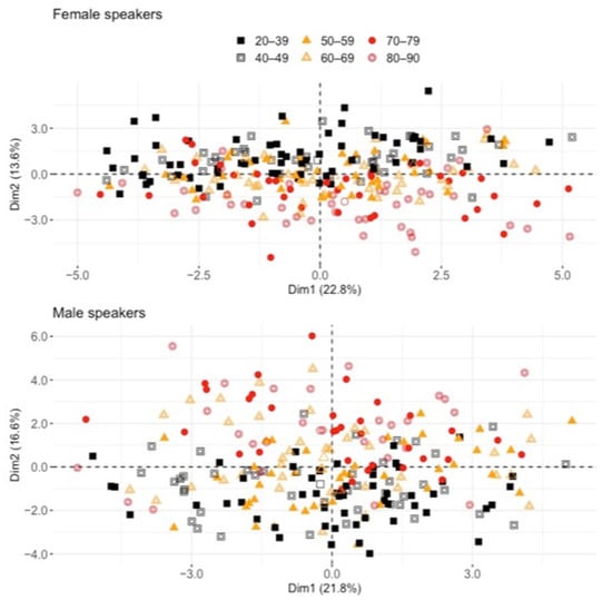 Figure 3 displays the distribution of the individual speakers in the space defined by the first two components. Speakers were coded according to their “age group” (below 40 and then per decade for a total of 6 age groups, differentiated by symbol shape and color) in order to evaluate whether they clustered together in one or any other dimensions. While no specific patterns were observed along PC1, PC2 contributed to the distinction between younger and older speakers for both sexes. In the bottom part of Figure 3, the youngest female speakers (aged 20 to 39, and most of 40 to 49 speakers with filled and unfilled black squares) were clustered on the upper part of the graph, while the older female speakers (70 to 79 and 80 to 90 with filled and unfilled red circles) clustered on the upper part. For the male speakers, in the upper part of the figure, younger (filled and unfilled black squares) and older participants (filled and unfilled red circles) were also divided along the PC2 dimension. Note that the reverse picture along PC2 between the male and female speakers (younger under or above PC2 = 0) is not meaningful here (this reflects the way the variables were automatically selected for computing the correlations).