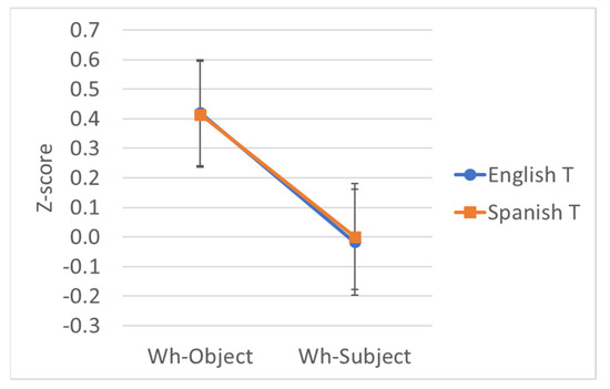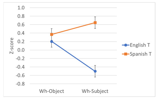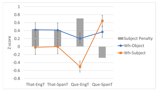 The code-switching stimuli were designed to test the availability of subject extraction in sentences with different combinations of C and T, so it had a 2 × 2 × 2 design: Wh-extraction (Subject vs. Object), language of C (English vs. Spanish), and language of T (English vs. Spanish), as shown in Table 5.