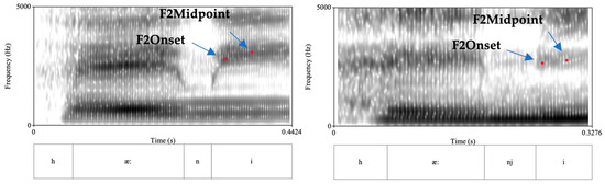 Spectrograms from two women: one non-palatalizer (left), showing a lower F2 at the ‘i’ vowel onset, and one palatalizer (right), showing higher F2 at onset, saying [hæ:ni] ‘male name, Hanny’.