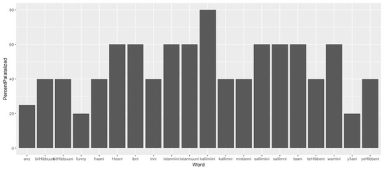 Some of the intra-speaker variation may be driven by lexical effects. Table 3 contains the proportion of palatalization in five of the seven speakers (two speakers were omitted as they were categorically either a palatalizer or non-palatalizer, revealing no by-word variation). The table and visualized data in Figure 2 show that the words produced with the fewest palatalized tokens—i.e., only 1 instance of (nj) code in each—were ya3ni [jaʕni], ‘I mean/meaning,’ which contains the voiced pharyngeal fricative known to have a formant-lowering effect, and the borrowed words (from English) funny and any. The word with the highest proportion of palatalized tokens is kallimiini ‘call me, 2nd, f.sg,’ (80%; Table 3). This is unusual, as other words with final /i:ni/ syllables should have had similar coarticulatory patterns, but this is not the case in the current findings. It is otherwise not immediately clear what unites the words that were or were not frequently palatalized, but English borrowings certainly seem to be among the least palatalized.