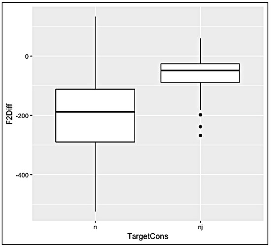 Upon examining F2Diff, it is apparent that these values distinguish tokens we heard as plain (n) vs. palatalized (nj). This is displayed in Figure 3, which demonstrates less of a difference between the two points measured in (nj), since the F2Onset is starting very high and barely moves to reach the F2Midpoint height of the /i:/ vowel. Contrarily, in plain (n), F2Onset starts at a lower point and moves higher into the vowel midpoint, so there is a greater height difference. Thus, a main effect of Auditory Code (n, nj) on F2Diff is observed (F = 4.06, df = 1, 112.67, p = 0.01, N = 99). The distinguishing cue appears to be around the 100 Hz mark, indicating that if F2Diff is less than 100 Hz, the auditory quality is likely palatalized, while an F2Diff greater than 100 Hz covaries with an auditorily non-palatalized nasal. The average F2Diff is −62.4 Hz for palatalized codes, and −209.5 Hz for the non-palatalized ones.
