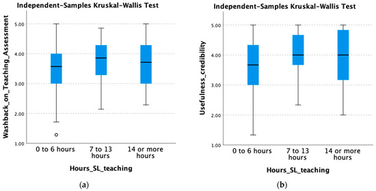 Between-group Differences: (a) Washback on Teaching and Assessment * Hours of SL Teaching; (b) Usefulness and Credibility * Hours of SL Teaching.